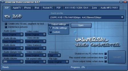 Universal Video converter is an intuitive to use program which convert your favourite video files to file for playing on iPod iPhone PSP 3GP Zune AppleTV easily and quickly! Watch your own Videos on your mobile device anytime, anywhere. It features superb video & audio quality and the fastest conversion techniques available on the market. Universal Video Converter has an user-friendly interface making it extremely easy to use.